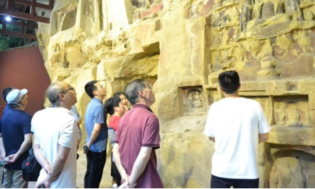 师生党员在讲解员的引导下参观千佛岩石窟。