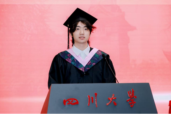 2021级历史学基地班郭威炎作为本科生毕业生代表发言。他深情回顾了四年川大时光。他说四年前怀揣憧憬踏入川大a漫
