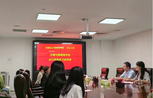 文物与博物馆专业2023年秋成都金沙遗址博物馆实习启动会”在成都金沙遗址博物馆办公区307会议室顺利举行。成都金沙遗址博物馆副馆长王方研究馆员、专职副书记郑漫丽副研究馆员、实习带队教师a漫