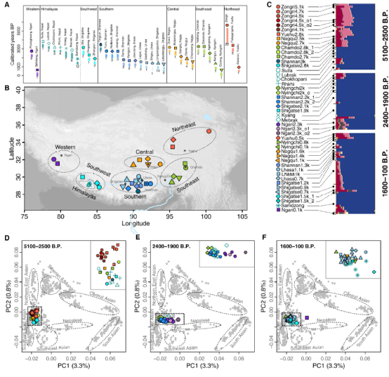 图1:(A-B)研究涉及青藏高原古人群的时间及地理分布。(C)ADMIXTURE分析。(D-F)主成分分析。注:图C中主要颜色对应的成分,蓝色,青藏高原成分;红色,东亚南部成分;粉红色,古代西伯利亚北部成分;黄色/灰色,中亚成分。