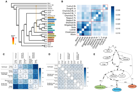 图2:(A)最大似然树。(B)Outgroup f3热图。(C-D)Fst热图。(E)qpGraph结果。