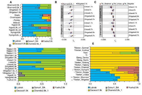 图4:不同时间及地区高原人群F4及qpAdm结果。