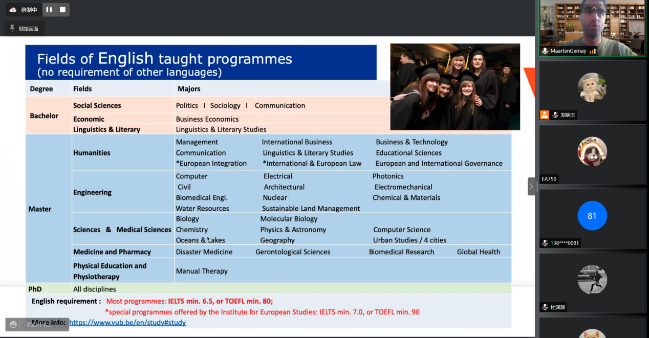 2022年海外项目宣传月线上宣讲会陆续开展。本次宣讲会有来自美国、英国、新加坡、比利时、泰国等国家的十余所全球知名高校的代表和同学们在“云端”相会,截至目前已开展了十二次场宣讲会,参会人员达数百人,每场宣讲会都受到了同学们的热烈欢迎,干货满满。