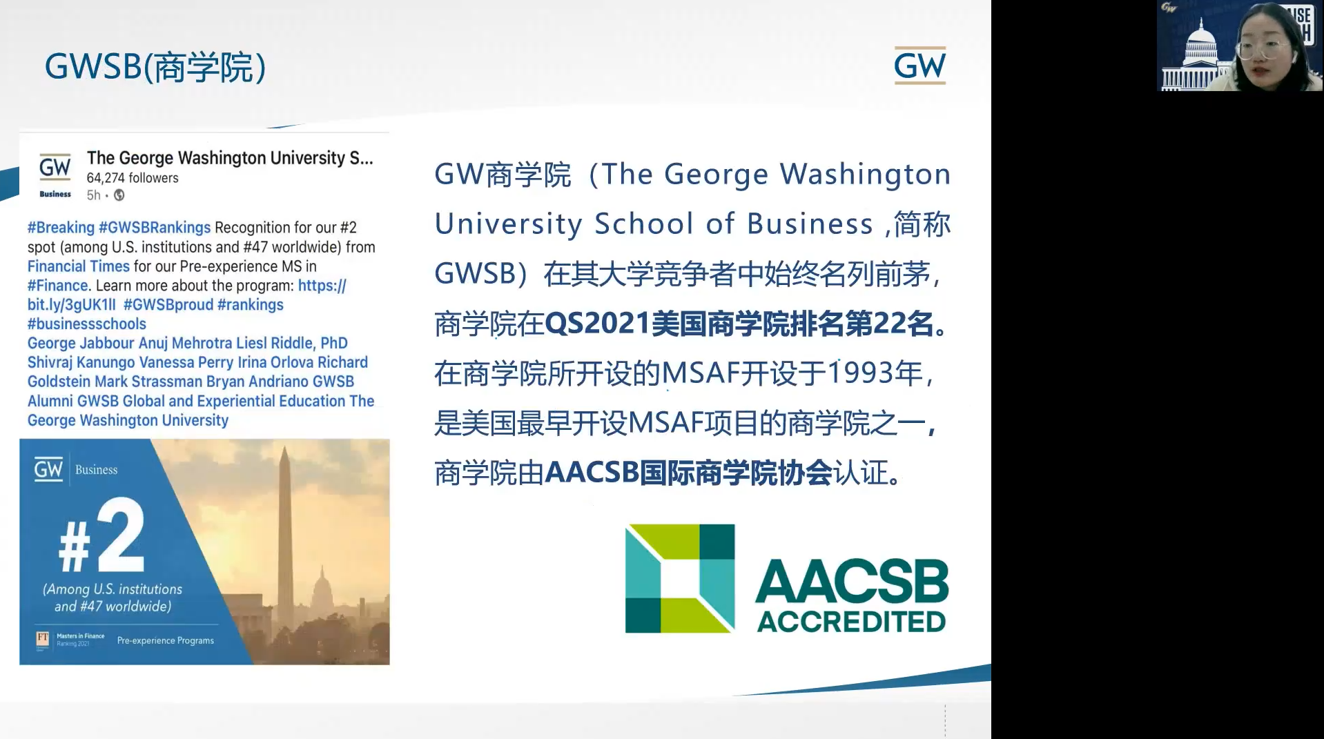 美国乔治·华盛顿大学商学院宣讲会(2022年3月28日):应用金融学硕士项目。学校历史悠久,富有底蕴。乔治·华盛顿大学(GW)创立于1821年,是美国顶尖的私立研究性大学。大学在美国大学竞争者中始终名列前茅,商学院在QS2021美国商学院排名第22名,是美国最早开设MSAF项目的商学院之一,获得 AACSB国际商学院协会认证。在最新的《金融时报》中,GWSB的应用金融学硕士项目在全美排名第2名,世界排名第47名。