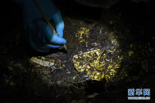 在位于四川省广汉市的三星堆遗址5号“祭祀坑”中,考古人员在清理新发现的金面具残片(3月1日摄)。 新华社记者 沈伯韩 摄