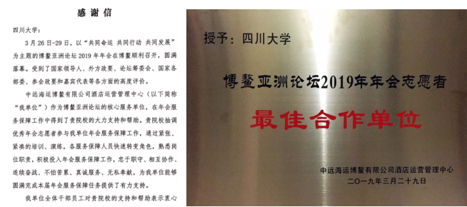 志愿者服务进行了报道;3月28日,巴基斯坦前总理对川大志愿者高质量服务进行表扬和赞美;4月3日,中远海运博鳌有限公司酒店运营管理中心特意为a漫