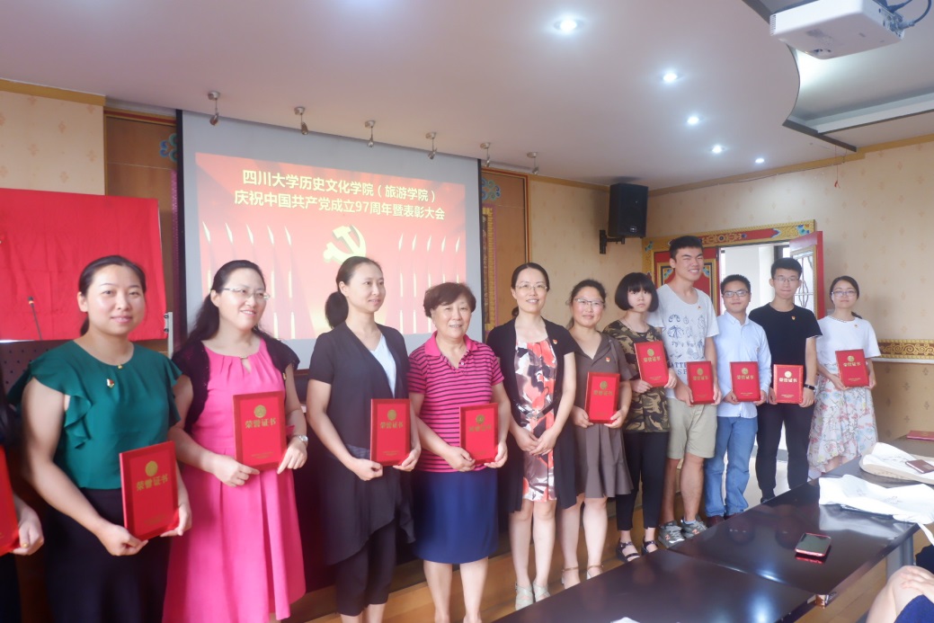(旅游学院)庆祝中国共产党成立97周年暨表彰大会在望江校区文科楼五楼藏研所会议室隆重举行。学院党委书记陶宏、副书记姜华、学院副院长王果、a漫