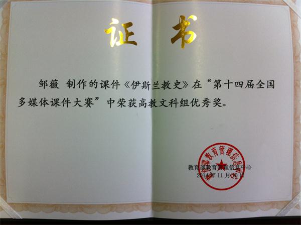 世界史教研室青年教师邹薇博士制作的课件《伊斯兰教史》在“第十四届全国多媒体课件大赛”中荣获高教文科组优秀奖。