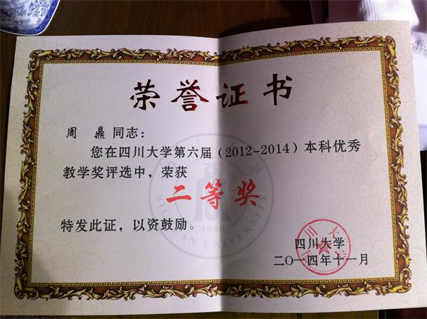 第六届本科教学优秀奖“二等奖”。周老师为我校本科生开设了《百年风流:近代中国人物漫谈》、《中华文化》(历史篇)等文化素质公选课,深受全校学生欢迎,学生们这样评价周老师的课程:周鼎老师的课很有魅力,老师善用通俗易懂的语言讲出深刻的哲理,让人回味再三幽默风趣,旁征博引,点评深刻,对中国历史上的名士讲解得深入透彻;周老师讲课技巧很好,循循善诱,条理清楚,学这个课程对我非常有用,值得认真学习;全校非常受欢迎的课程,选课人数差不多能把系统给搞崩溃掉。