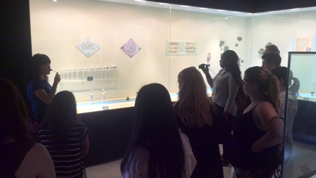 博物馆是中国西南地区建立最早的博物馆,也是中国历史最悠久的博物馆之一,至今已有九十多年的历史。上午的天气尽管稍显闷热,但依然阻挡不了留学生朋友们的猎奇之心。在博物馆英文讲解员的带领下,大家首先来到博物馆负一楼的石刻艺术陈列馆。走进布置精美的展厅,一阵清凉袭来,大家仿佛置身于一间幽静的地下石室。讲解员有序地向外国朋友们介绍着这些从东汉、南北朝等不同时期出土的石刻艺术,大家细致地边听边看,还不时拿出相机拍摄着。接着一行人先后参观了民俗学陈列馆、民族学陈列馆、书画艺术厅、古代瓷器厅、古代服饰艺术厅等几个基本展馆。有趣的皮影戏,神秘的藏文化,高雅的书画、瓷器,精美的古代女子服饰等等都让外国朋友们甚感新奇,不时驻足停留细致察看,一边还听着讲解员述说着一件件陈列品背后那耐人寻味的中国故事。