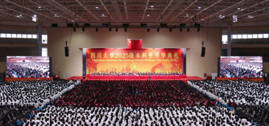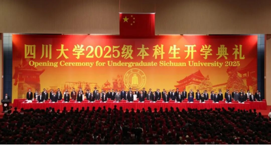 2025级本科生开学典礼在江安校区隆重举行。校党委书记甘霖、校长汪劲松,高洁院士、魏于全院士、石碧院士、曹顺庆杰出教授、詹石窗杰出教授、霍巍杰出教授、徐玖平杰出教授,全体在校校领导,校友代表叶国安院士,教师代表赖波教授,各学院主要负责人在主席台就坐。机关部处及业务实体单位的主要负责人,各学院分管学生工作的副书记、本科新生辅导员,全体2025级本科同学和家长代表参加典礼,校党委副书记刘晓虎主持。典礼在庄严的国歌声中拉开帷幕。